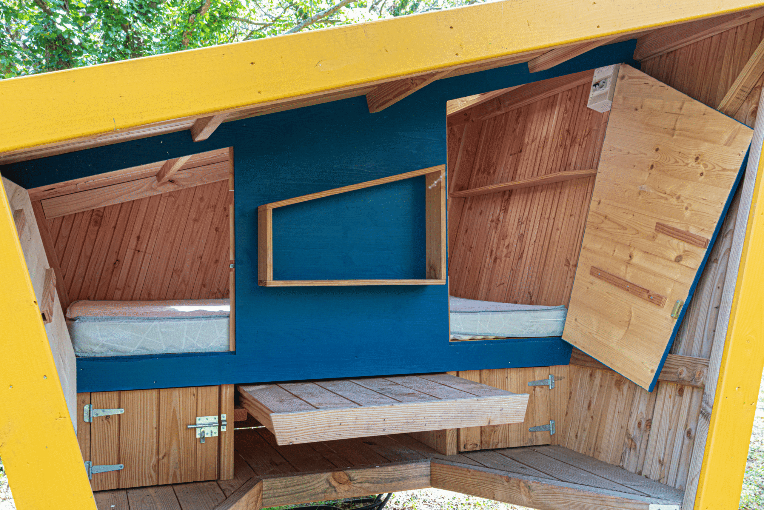 Cette cabane étape en bois est une solution simple et efficace pour les campeurs à la recherche de liberté et de confort. Nos cabanes 2 personnes sont équipées d'un lit double en 140 x 190 avec oreillers. Prise électrique, casiers de rangement, table coulissante et bancs sur une terrasse semi-abritée et stationnement compris. Sanitaires accessibles avec douche, WC, espace vaisselle et lavabos. Linge de lit non fourni (kit draps/couverture en option payante) et petit-déjeuner à l’hôtel en option.