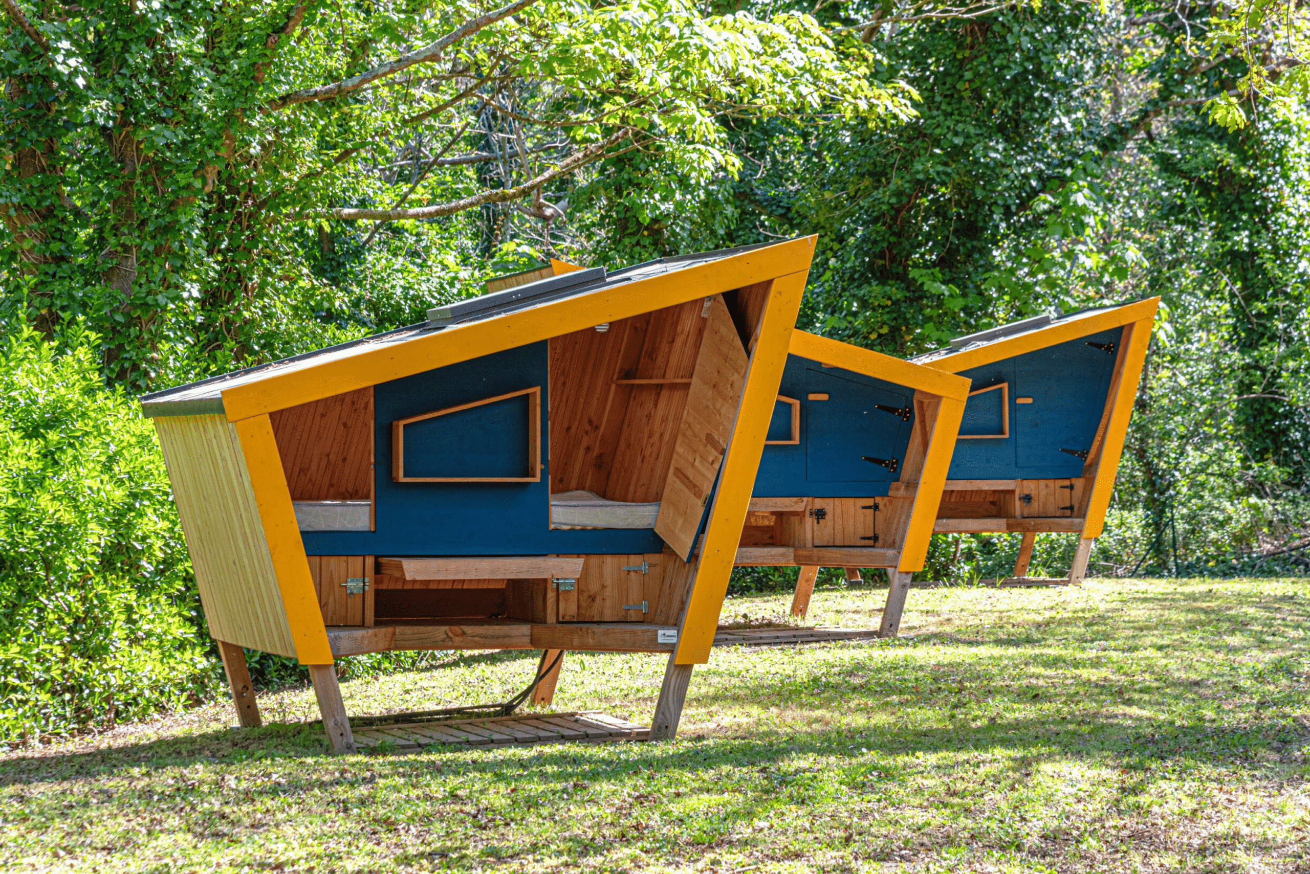 Cette cabane étape en bois est une solution simple et efficace pour les campeurs à la recherche de liberté et de confort. Nos cabanes 4 personnes se composent de 2 espaces : 1 lit double en 160 + 2 lits simples, avec oreillers. Prises électriques, casiers de rangement, table coulissante et bancs sur une terrasse semi-abritée et stationnement compris. Sanitaires accessibles avec douche, WC, espace vaisselle et lavabos. Linge de lit non fourni (kit draps/couverture en option payante) et petit-déjeuner à l’hôtel en option.
