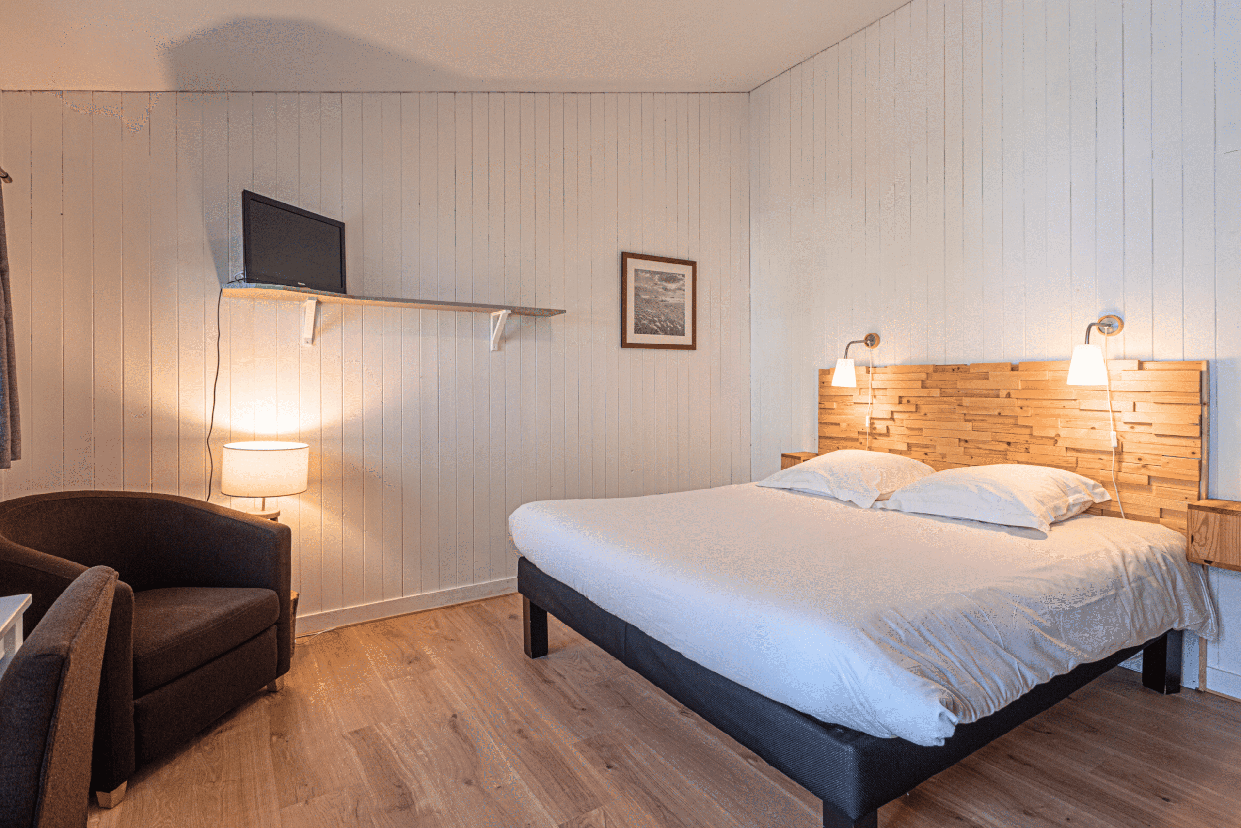 Nos chambres conforts sont chaleureuses et élégantes. Décorées avec soin dans un style naturel et épuré, nos chambres conforts vous offre calme et détente à deux pas du port d’Audierne. La chambre confort comprend un lit double en 160, un écran plat, un coin bureau et l’accès Wi-Fi.
