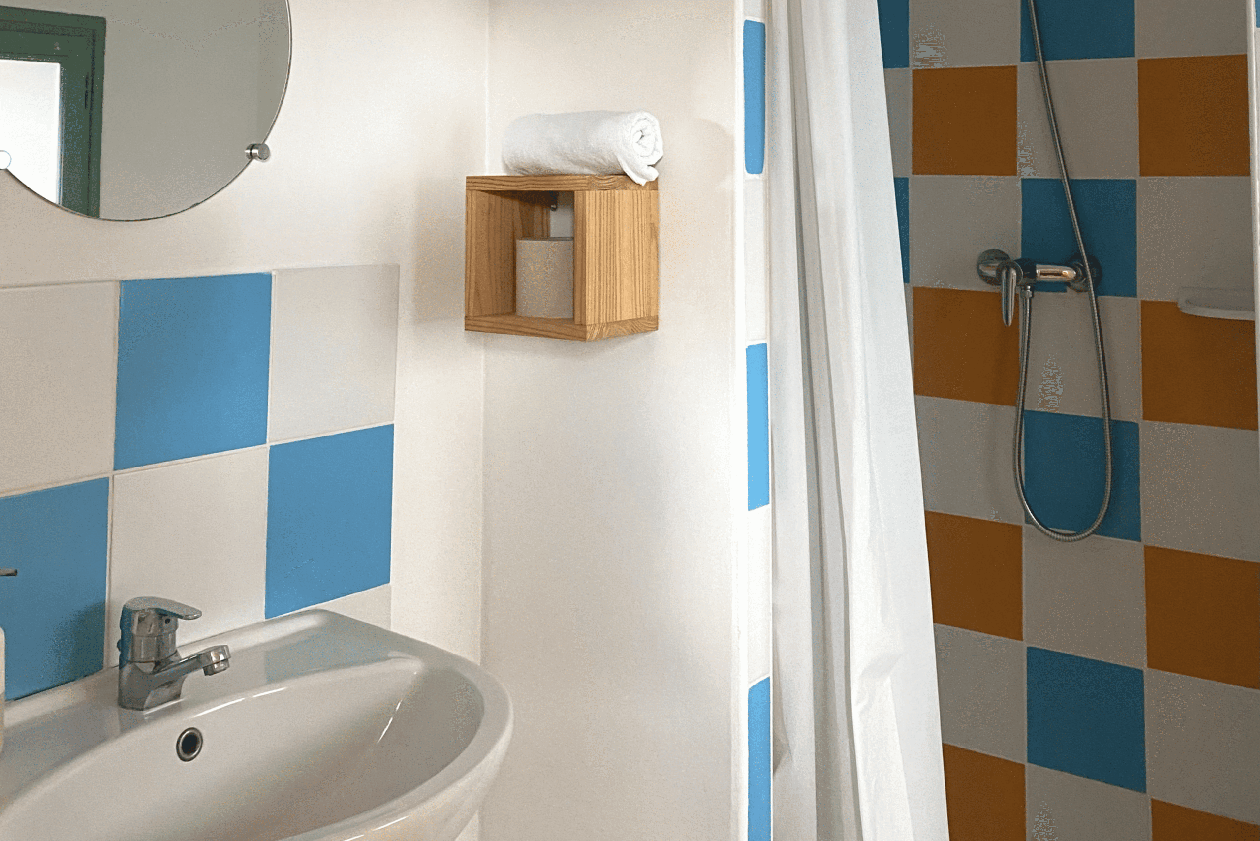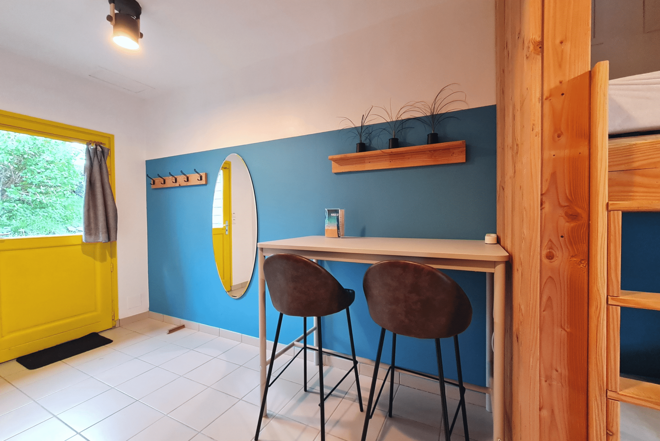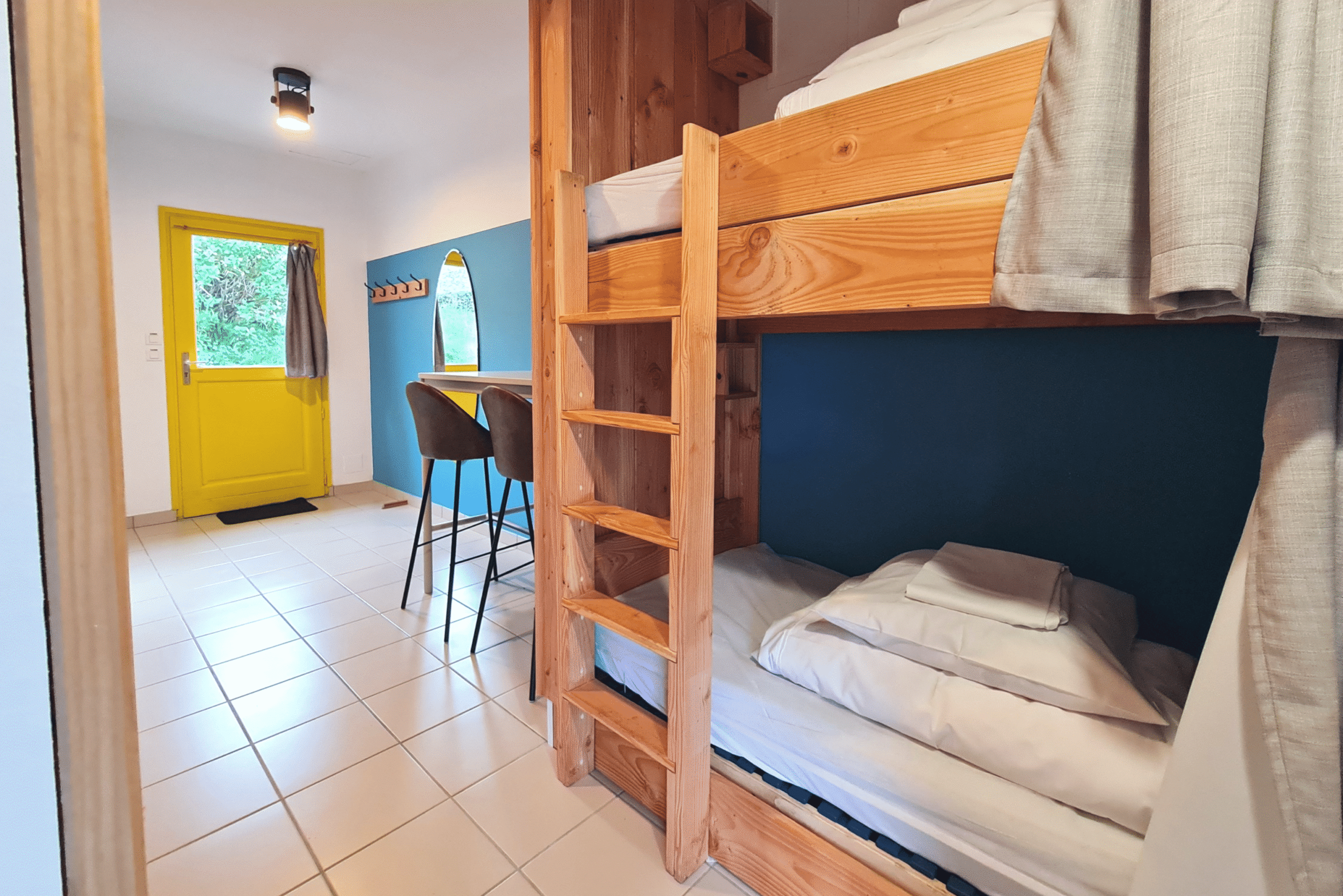 Décorée avec soin dans un style naturel et épuré, la chambre familiale vous offre calme et détente à 10 min à pied du port d’Audierne. Notre chambre familiale est composée de 2 chambres communicantes avec une salle de bain entre les deux. Une chambre avec un lit double en 160 et 1 lit simple, et l’autre avec 2 lits superposés (dont un avec lit double/lit simple). Notre chambre pour les familles comprend également un écran plat, un coin bureau et l’accès Wi-Fi.