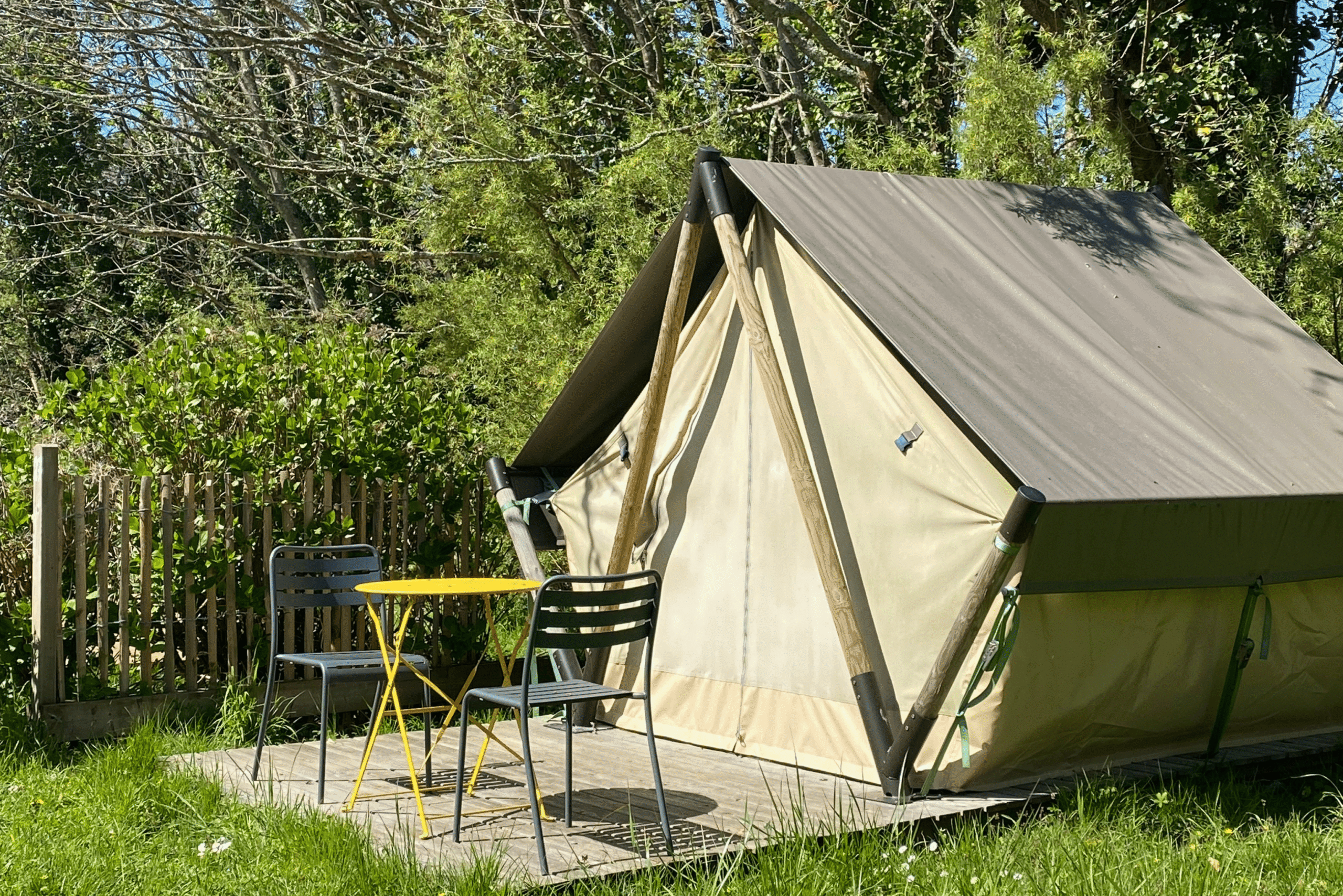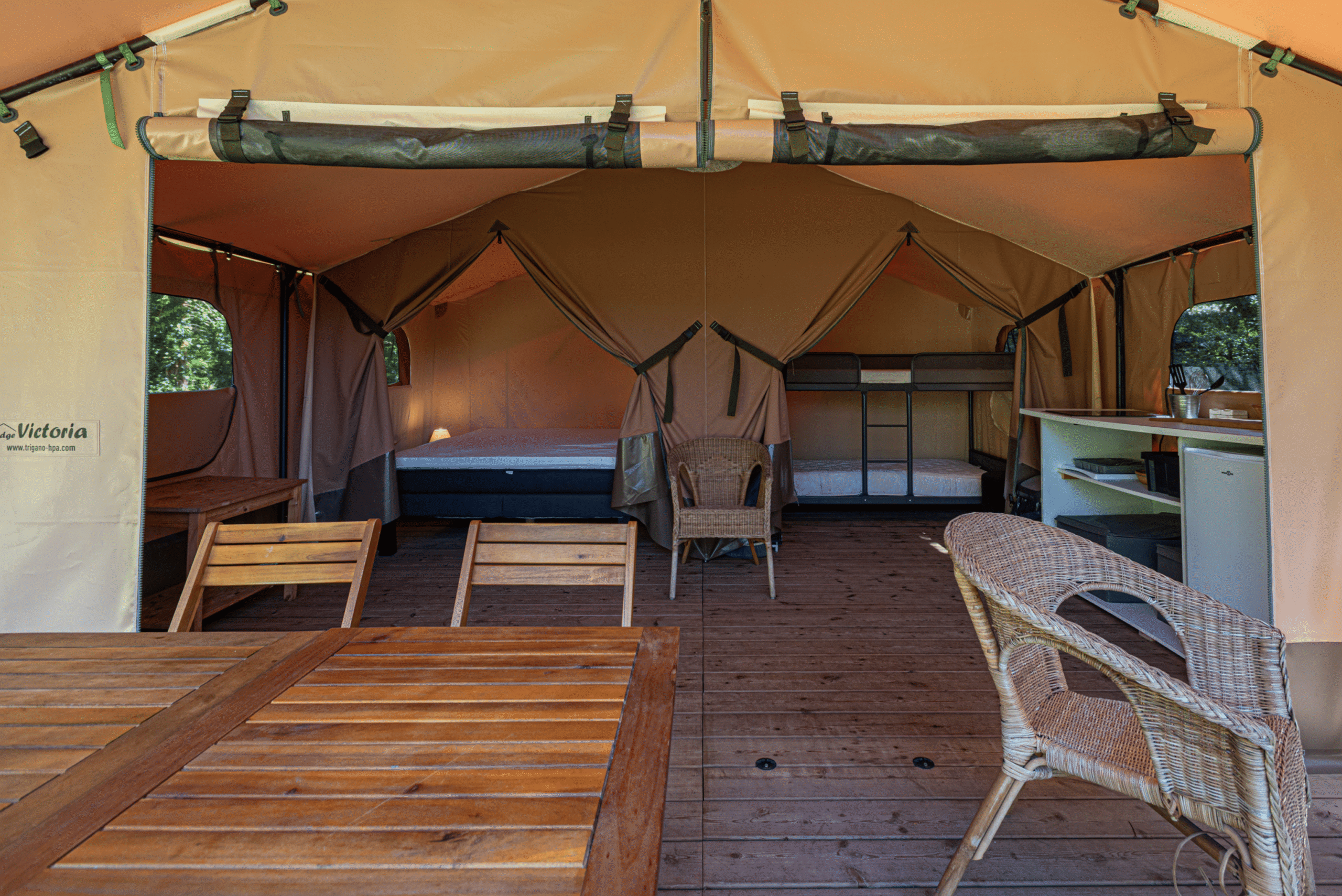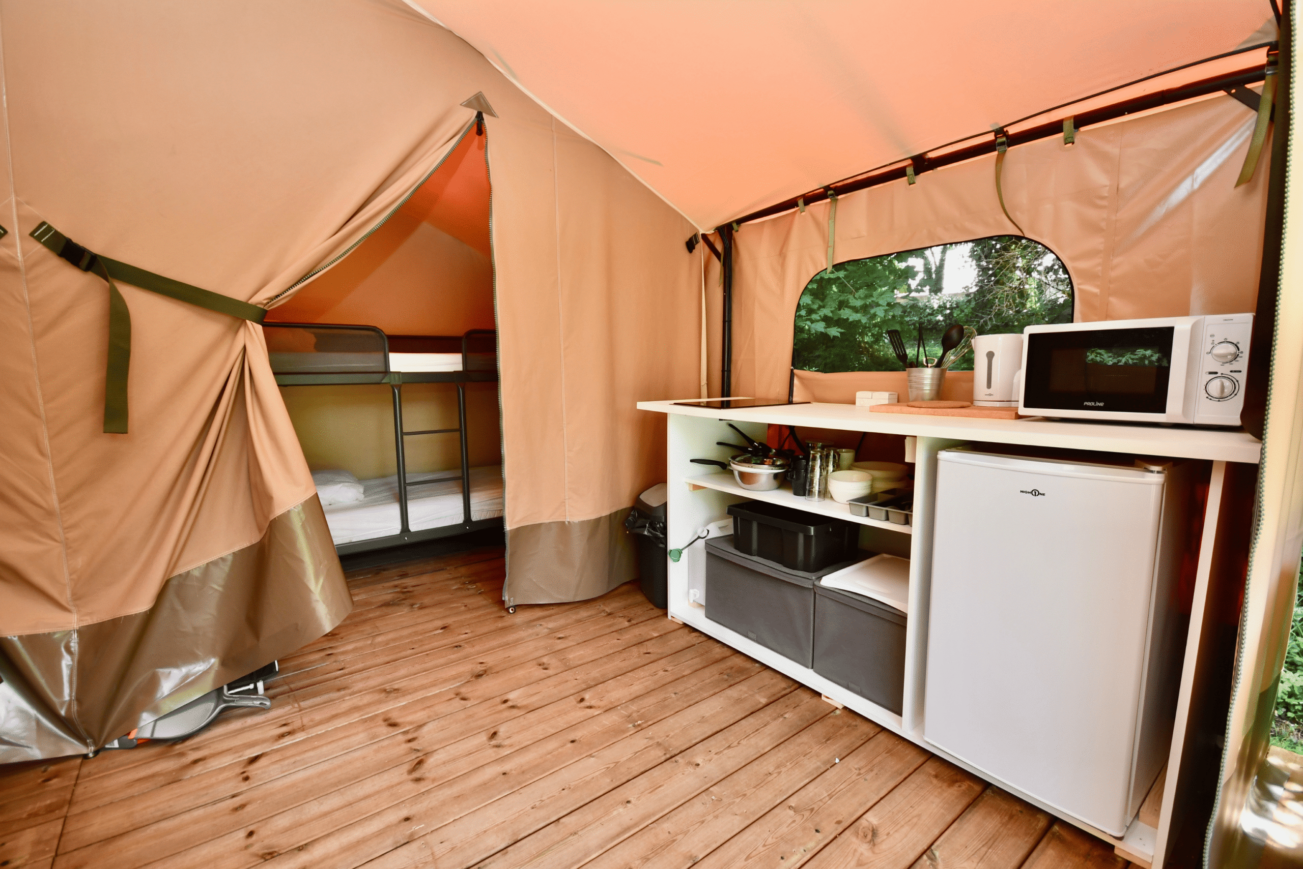 Cette tente est une solution simple et efficace pour les campeurs à la recherche de liberté et de confort. Nos tentes lodges sont équipées d’un lit double (160) et de 2 lits simples (superposés ou non) avec oreillers. Prises électriques, rangement, cuisine équipée (frigo, plaques chauffantes, bouilloire, cafetière, micro-onde, ustensiles et vaisselle), table et chaises, transat sur terrasse abritée et stationnement compris. Linge de lit non fourni (kit draps/couverture en option payante).