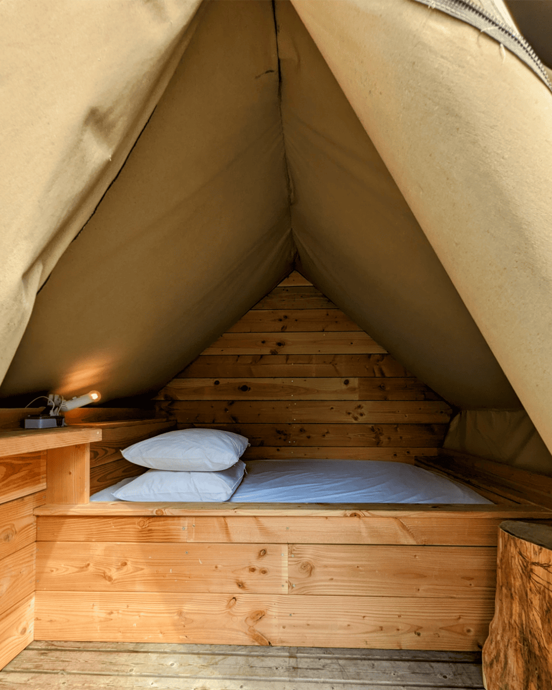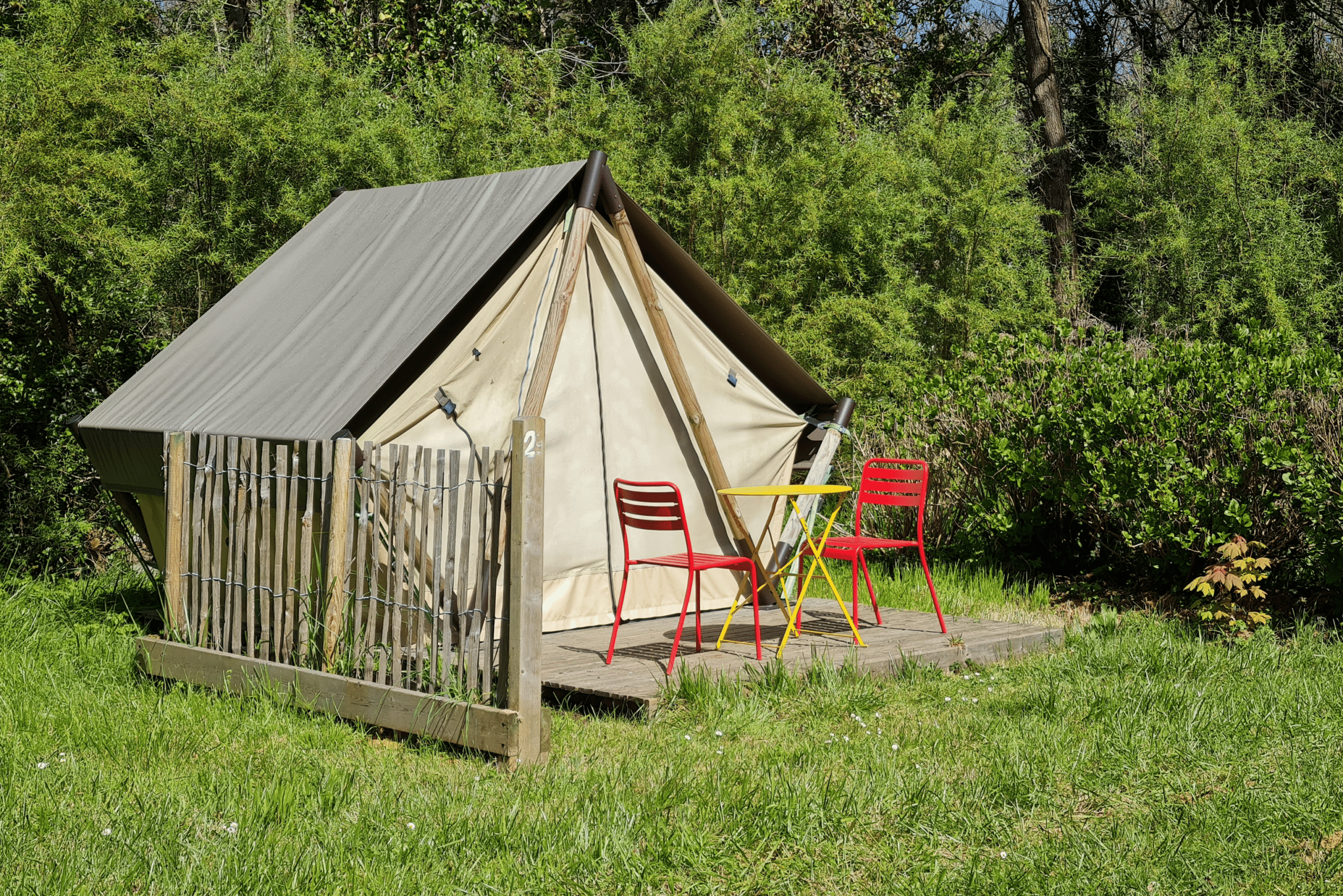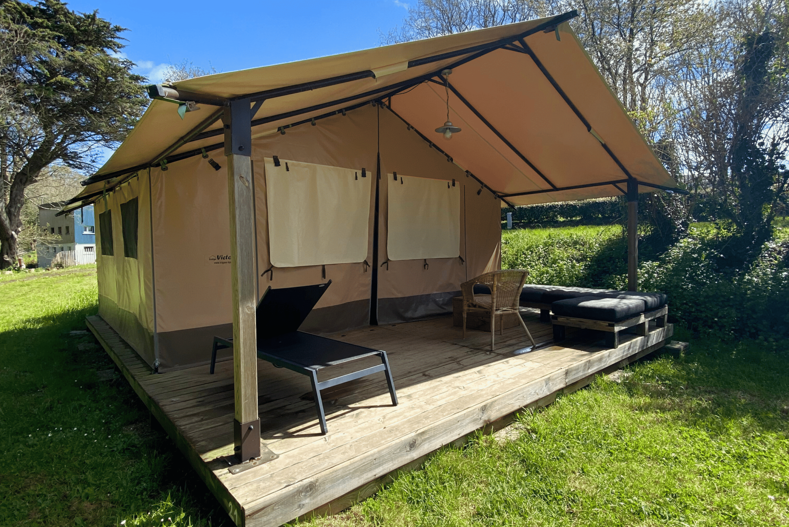 Cette tente est une solution simple et efficace pour les campeurs à la recherche de liberté et de confort. Nos tentes lodges sont équipées d'un lit double en 140 avec oreillers. Prise électrique, petit rangement, table et chaises sur la terrasse et stationnement compris. Linge de lit non fourni (kit draps/couverture en option payante) et petit-déjeuner à l’hôtel en option.